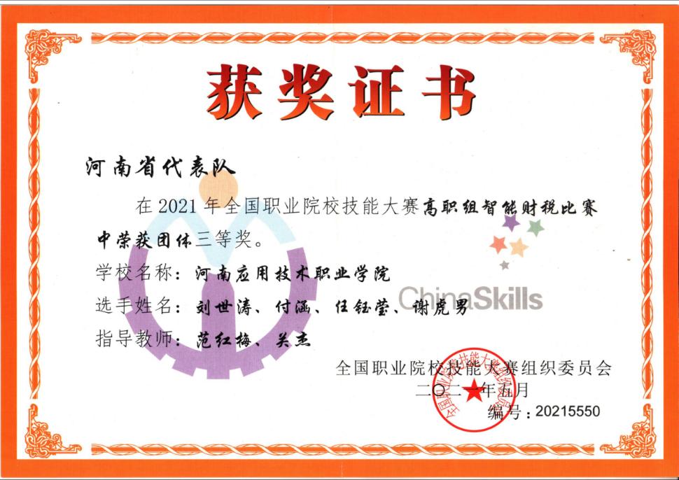 注会1902班是一个团结向上的班集体。同学们有强烈的集体荣誉感,该班曾获学校先进班集体。班级学风浓郁,得到了任课老师的一致好评。全学年专业课平均成绩年级第一。5人在大一、大二期间已通过全国会计专业技术初级资格证书。该班刘世涛同学在2021年河南省高等职业教育技能竞赛智能财税赛项中,以总分河南省第一名的成绩获得一等奖,在2021年全国职业院校技能大赛高职智能财税比赛中,获得三等奖,刘世涛本人获得了2021年国家奖学金。该班罗艺萌同学在全国个税计算职业技能大赛总决赛中取得二等奖的优异成绩。班内多位同学获得2021年全国大学生英语竞赛(NECG5)、2021全国高等职业院校发明杯大学生创新创业大赛、2020年长三角全球创意设计大赛、2020全国大学生职业发展大赛等各项奖,班级形成了比学赶帮超的氛围。