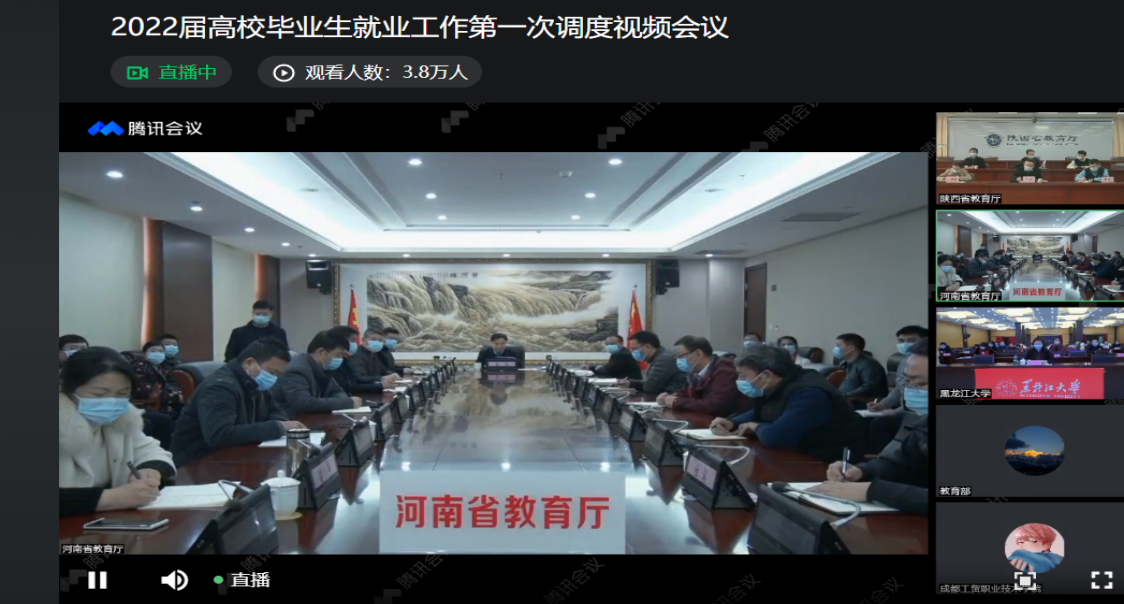 2022年1月18日下午14:30,教育部、人力资源社会保障部召开2022届全国普通高校毕业生就业工作第一次调度视频会议。河南省教育厅吕冰、四川省教育厅戴作安、陕西省教育厅高岭、电子科技大学申小蓉、中国政法大学李秀云、黑龙江大学丁宏、合肥职业技术学院王杰才,代表单位作了交流发言,介绍了本单位落实全国2021届高校毕业生就业工作会议精神、推进毕业生就业的工作情况。全国就业指导中心副主任宁小华认真总结了2021届高校毕业生就业工作,分享了全国就业指导中心在促进2022届高校毕业生稳就业促就业工作举措。最后,学生司副司长吴爱华肯定了2021届高校毕业生就业工作,分析了2022届高校毕业生就业形势及当前工作进展,安排了下一步就业工作部署。crown皇冠体育平台组织全体学工人员及毕业班辅导员通过线上观看直播的方式参加了本次视频会议。