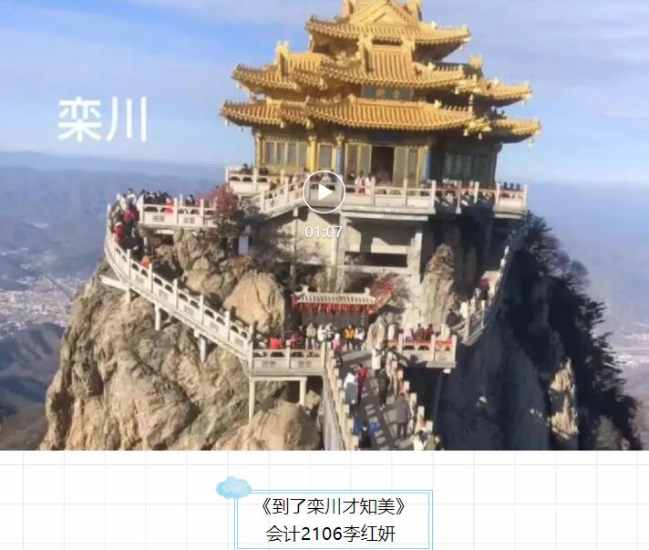 “远赴人间惊鸿宴,一睹人间盛世颜”,一不小心就踏入了人间仙境——洛阳栾川,她坐落于伏牛山脚下的一个风水宝地,有着“洛阳后花园”的美称,随着时代的变迁,栾川在变化,祖国也在变化。希望栾川的明天越来越好,祖国的明天更加富强!——《到了栾川才知美》会计2106李红妍