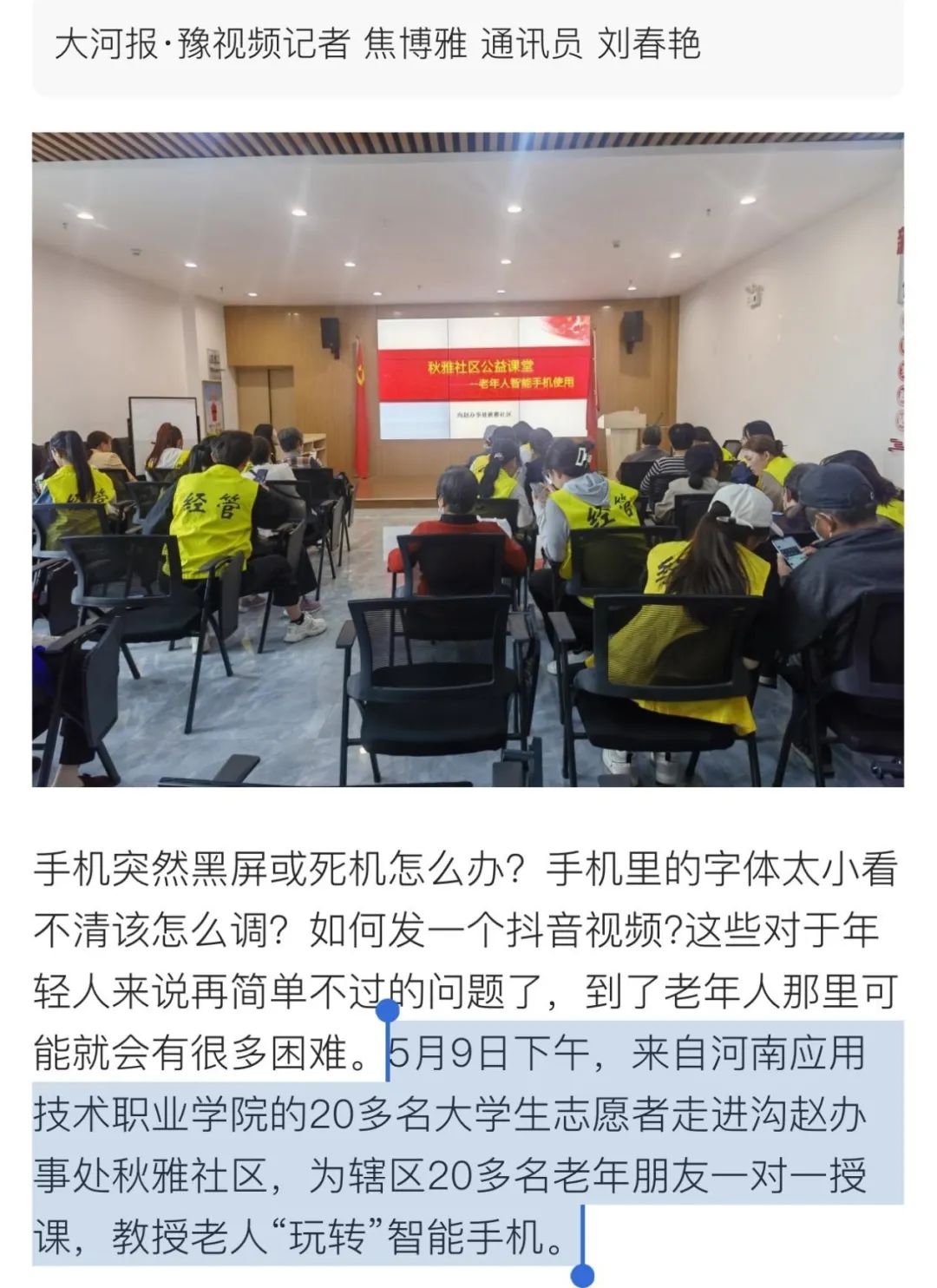 为深入学习贯彻习近平新时代中国特色社会主义思想,帮助老年人跨越数字鸿沟,培养青年学生社会责任感、使命感,5月9日下午,crown皇冠体育平台团总支带队青年志愿者前往“区校党建同创共建单位”高新区沟赵办事处秋雅社区党支部开展“老有所乐,智慧先行”主题实践活动。