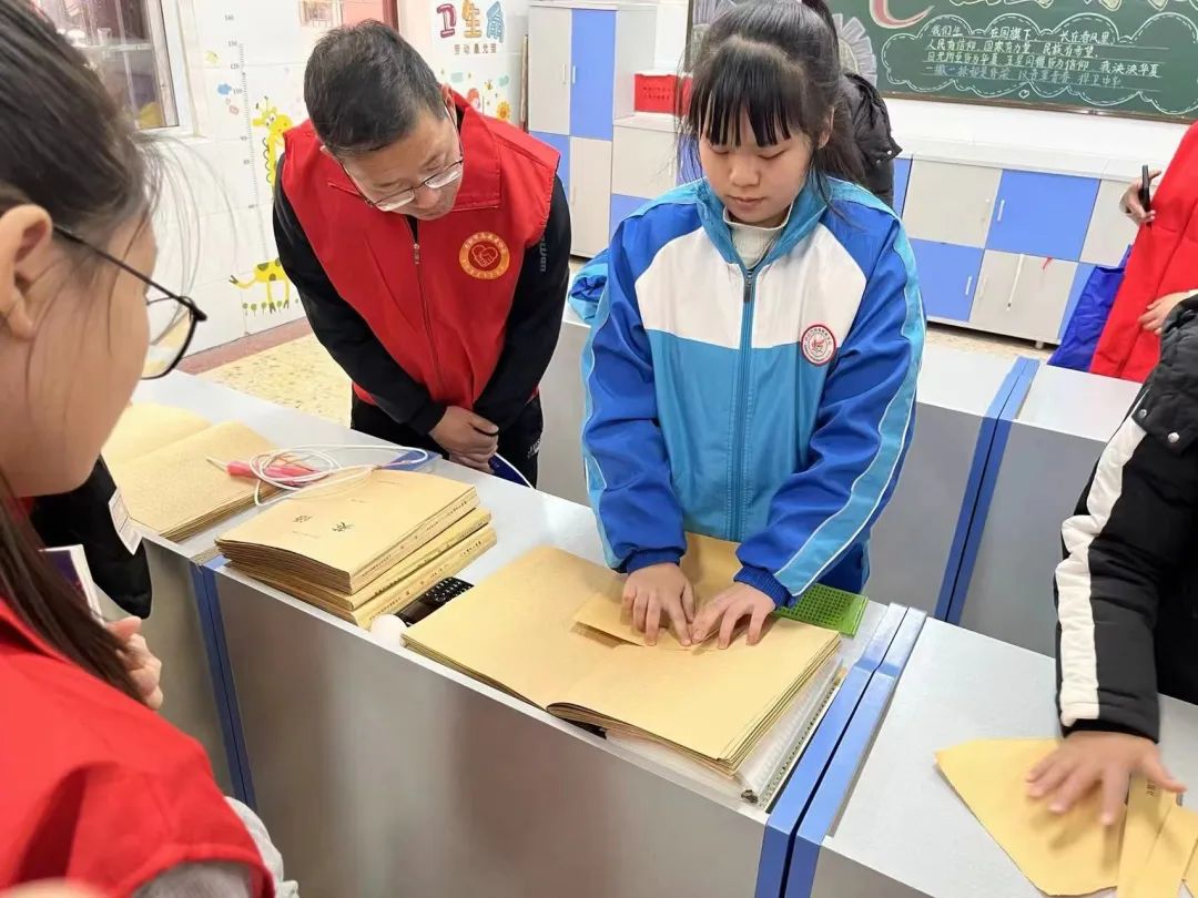 在视障六年级教室,志愿者们跟随专业老师学习盲人定向行走的知识,以及如何使用盲杖。了解到了更多关于盲文的知识,也更加理解了视障人群生活的不易。