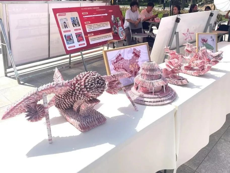 点钞券折纸展示环节同样精彩纷呈。学生们将普通的点钞券经过巧手折叠,变身为形态各异的艺术品,既有传统的折纸造型,也有富有创意的现代设计。这些作品不仅展示了学生们的巧思妙想,也体现了他们对专业技能的熟练掌握和灵活运用。