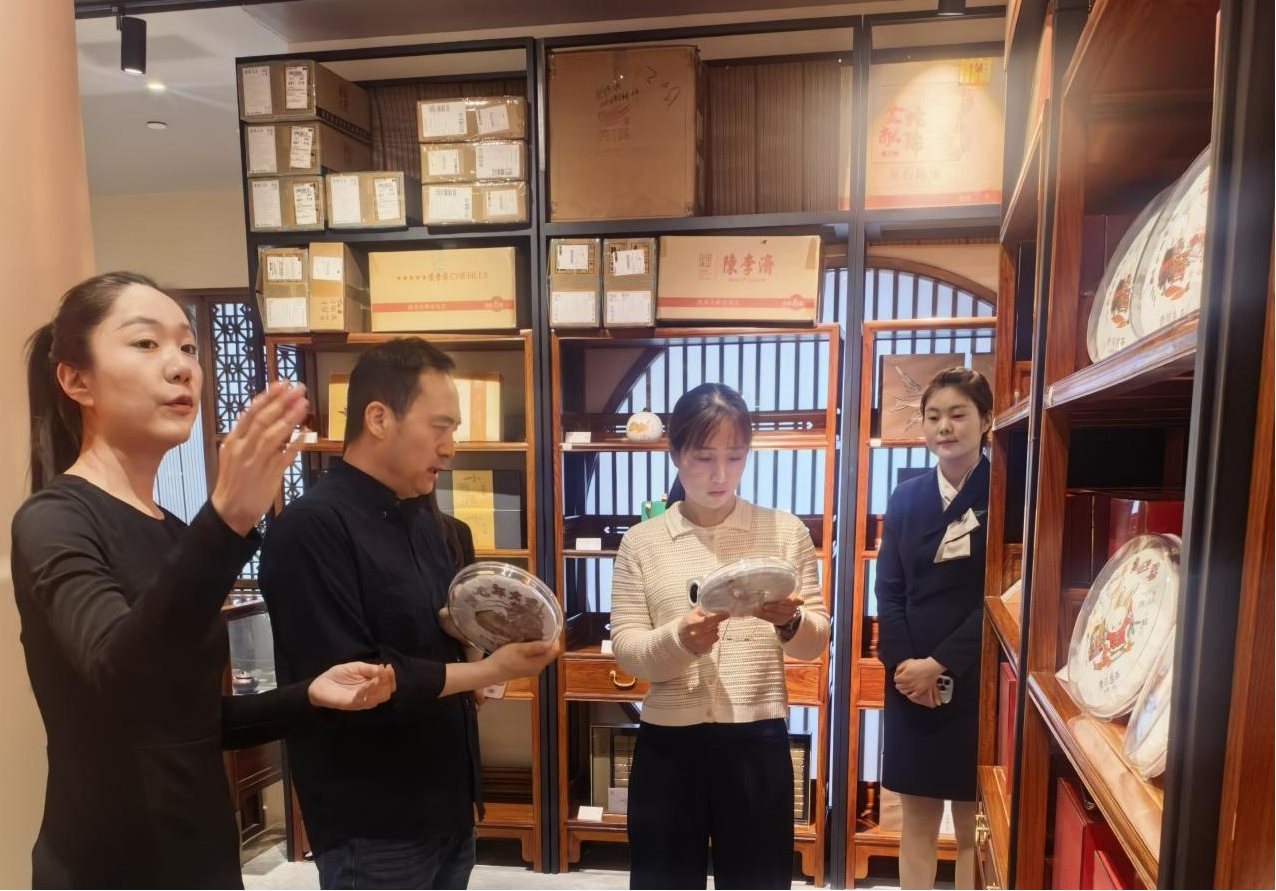 秦梅梅对王倩一行人的到访表示热烈欢迎。燕语茶馆于2021年4月开业,目前拥有1200平米茶空间,200多款茶品,10吨藏茶。秦梅梅详细介绍了企业的品牌理念、核心优势、运营模式,以及自己结缘燕语茶业背后的故事,并带领一行人实地参观了茶馆的运营区域、茶艺服务流程和特色文化空间,让大家直观了解茶馆的经营模式和服务标准。
